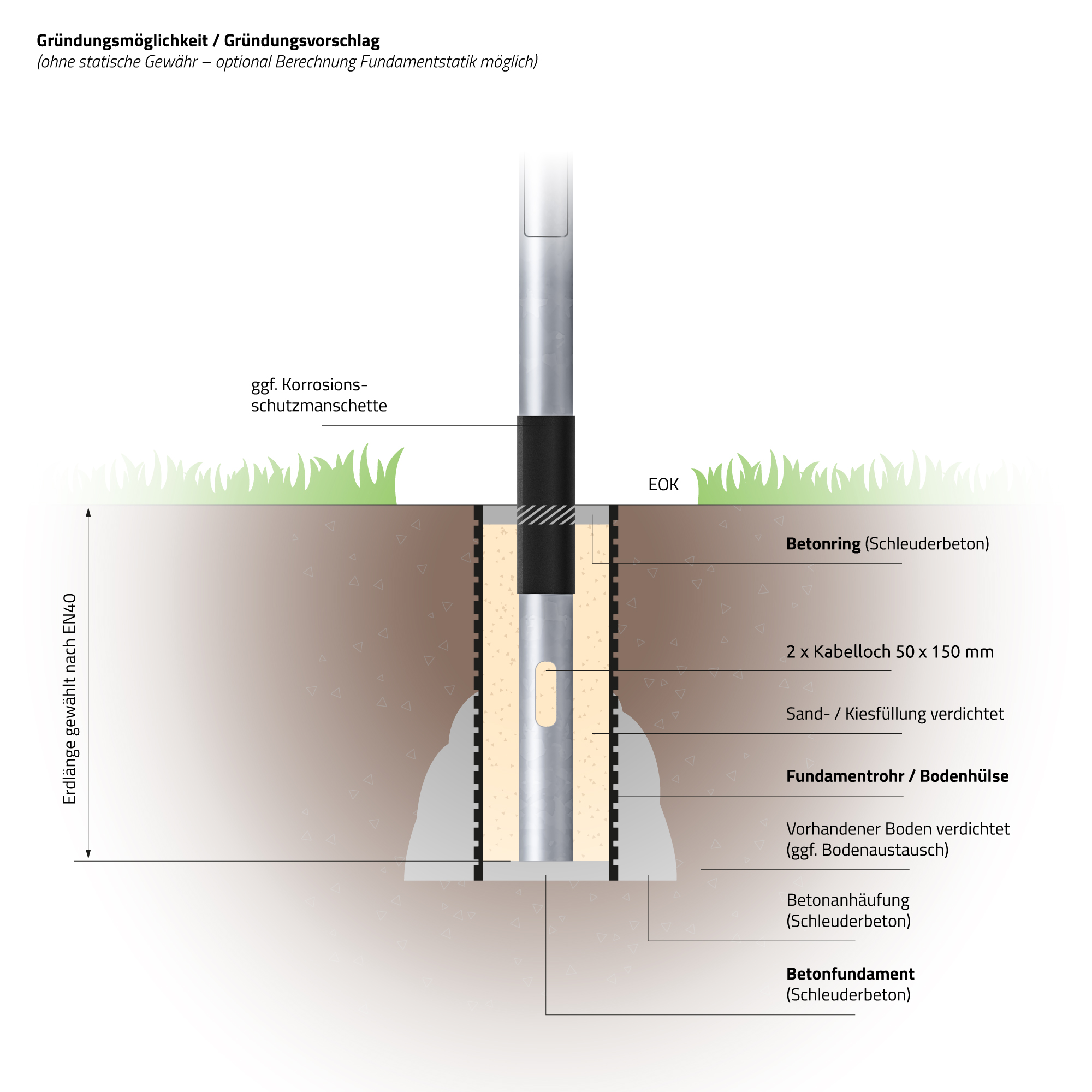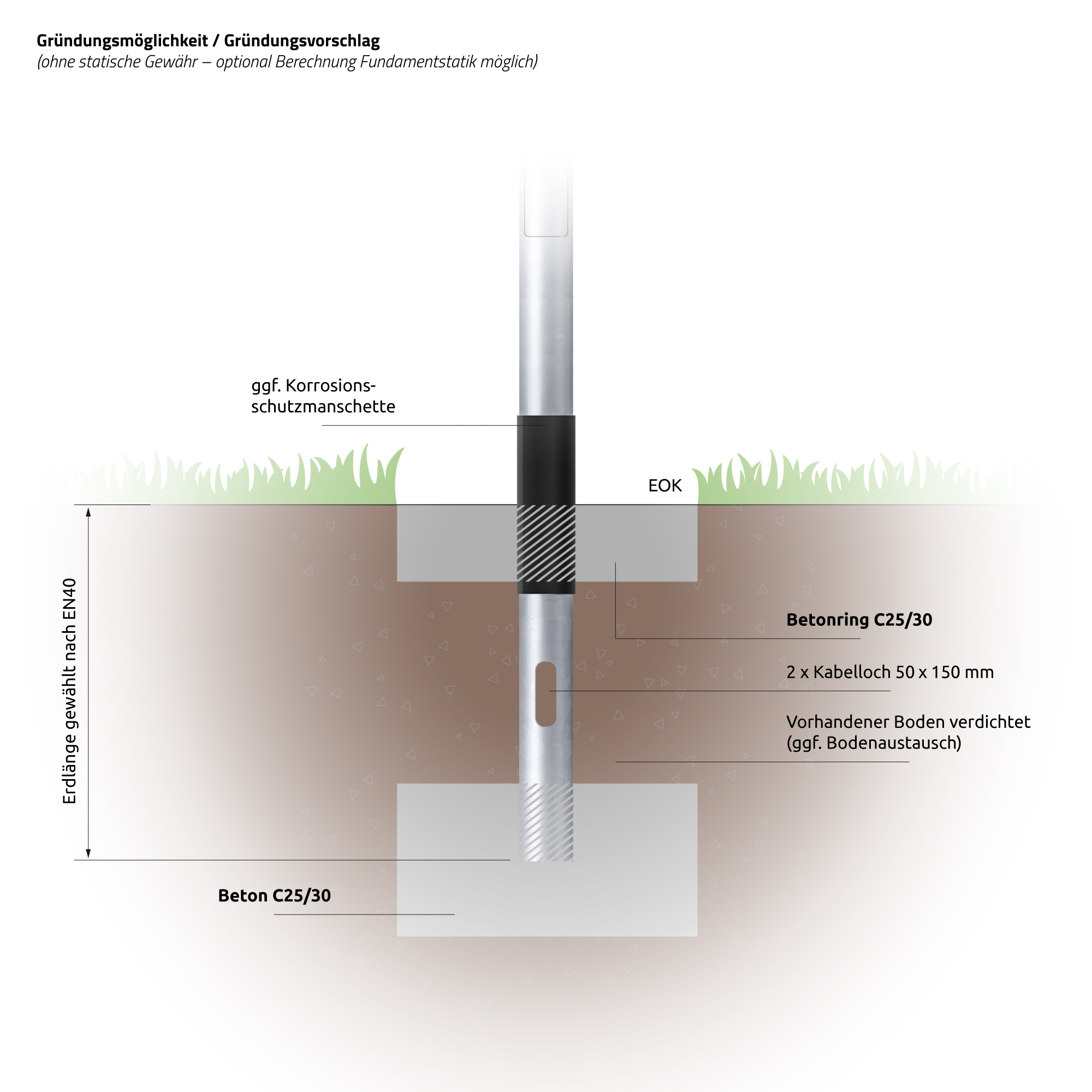 - 2x Kabelloch: 50 x 150 mm (UKT = 500 mm unter Erde,