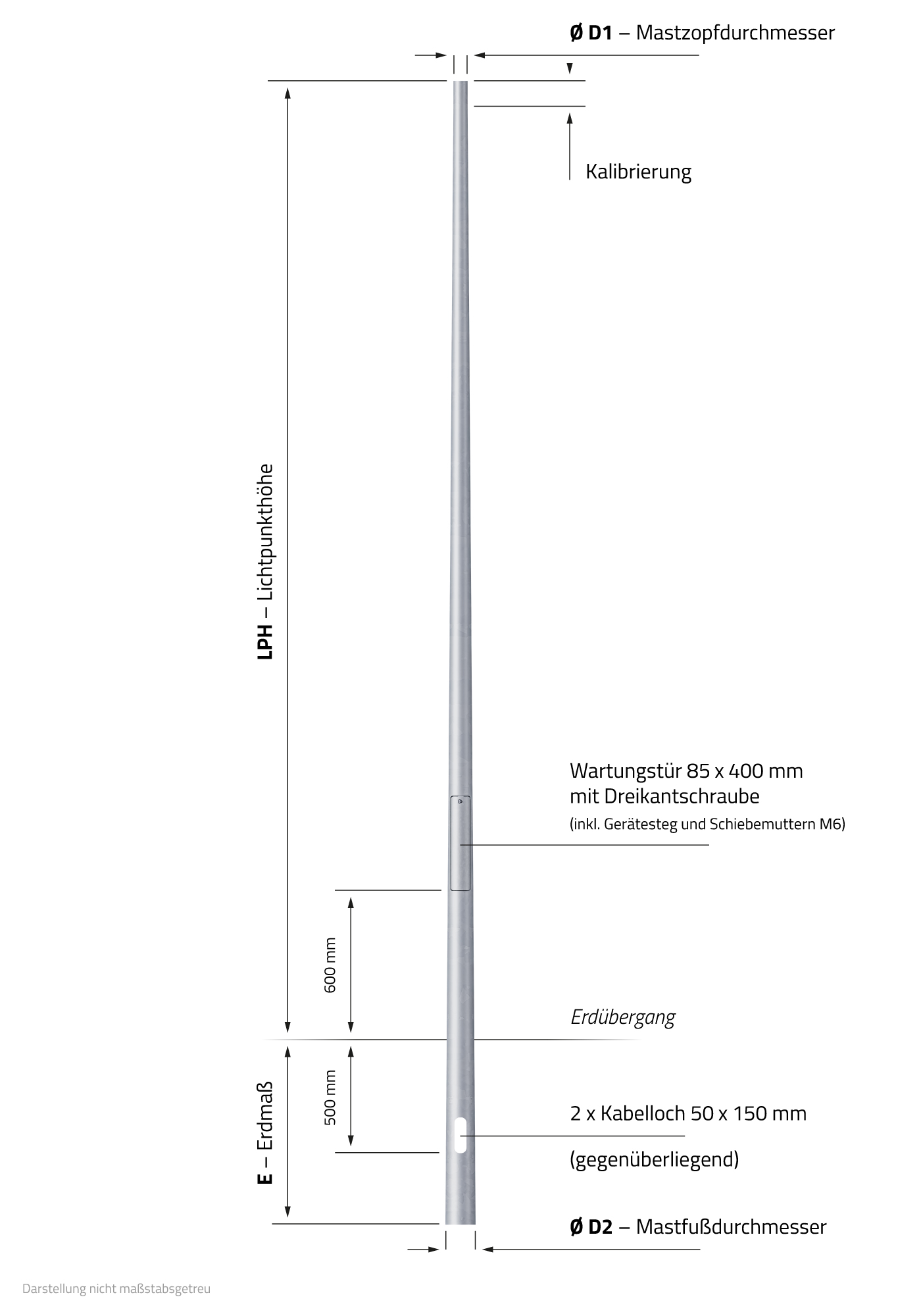 Das Zopfmaß (kalibriertes oberes Mast-Ende zur Befestigung der Aufsatzleuchte) beträgt 76 mm im Durchmesser, was ihn für fast alle Straßenleuchten bzw. Leuchtenköpfe (auch LED) als geeignet einstuft. Die Kabeleinführung erfolgt erdseitig. In gut erreichbarer Griffhöhe befindet sich die Wartungstüre welche zur Herstellung der Kabelverbindungen und dem Setzen von Muffen o.Ä. genutzt wird.